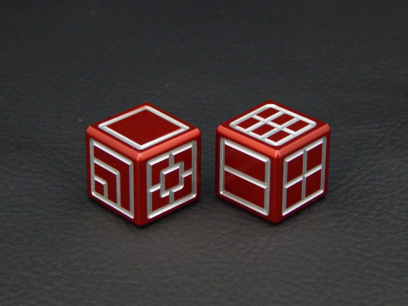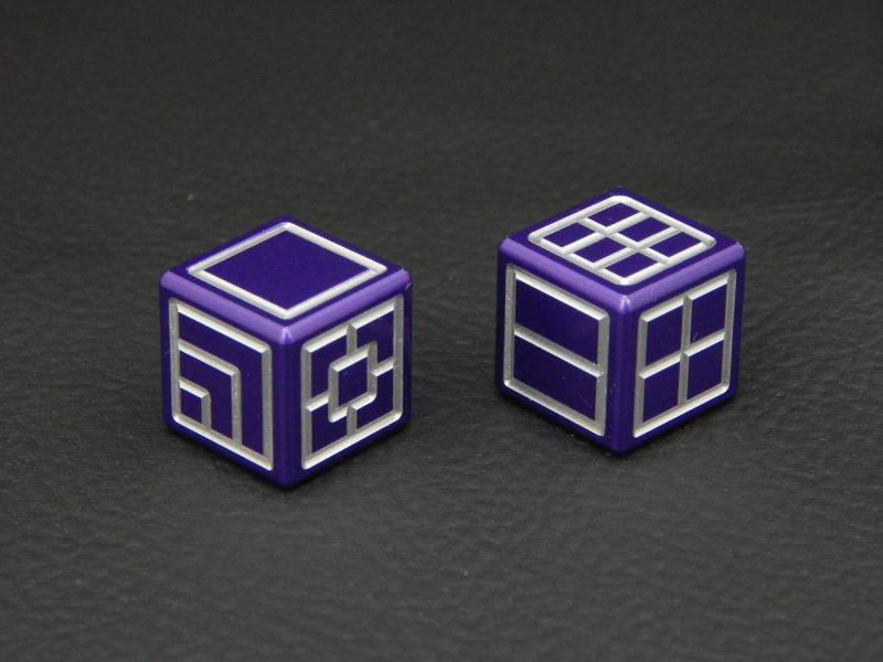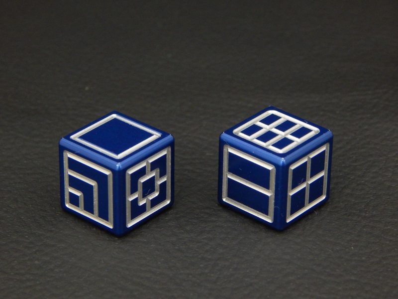 This concept is an updated, modern version of traditional pip dice (d6), using extra large pips instead. Machined from solid aluminum, these dice are CNC milled into standard 16mm size and anodized for a beautiful, vibrant finish.