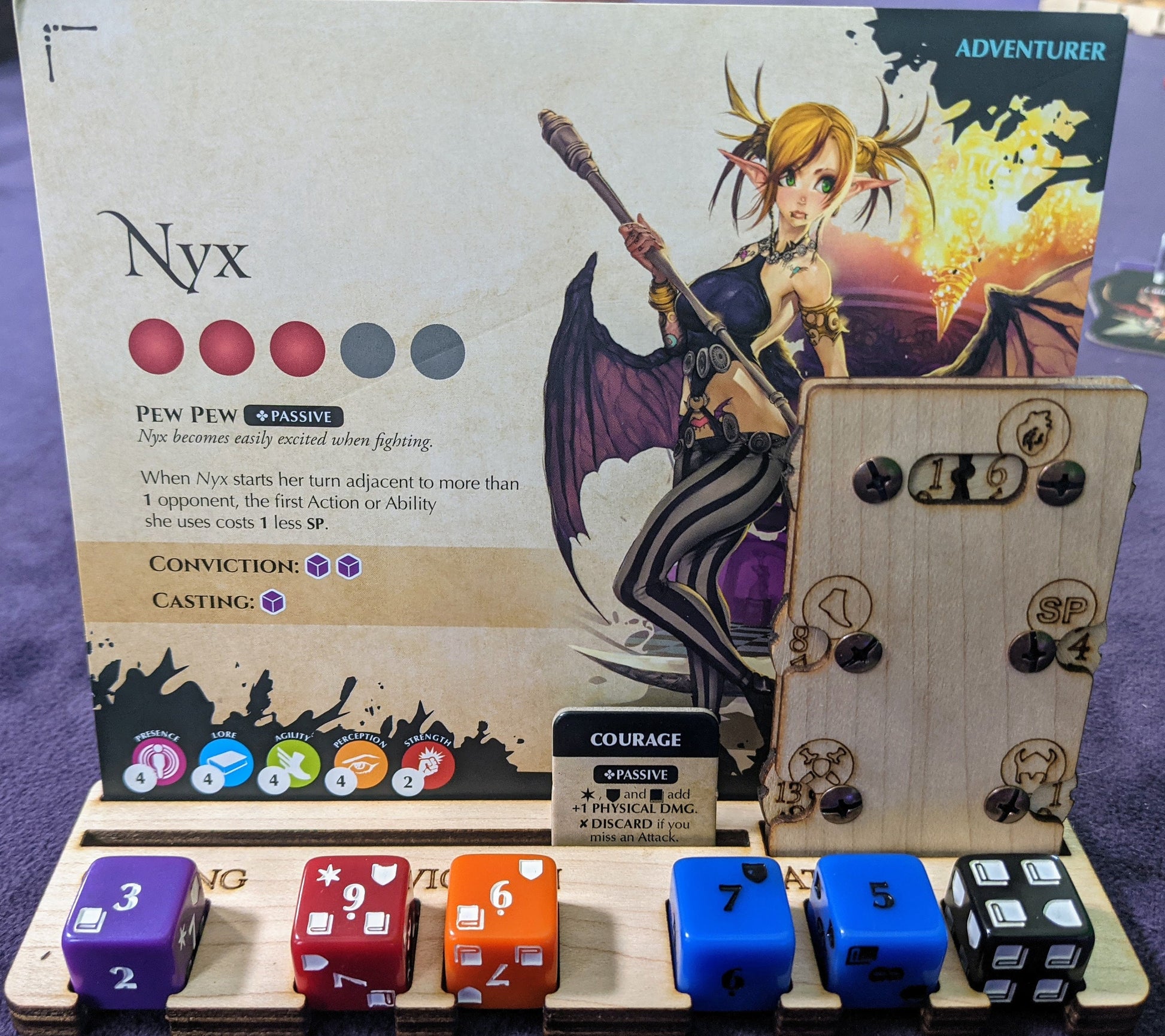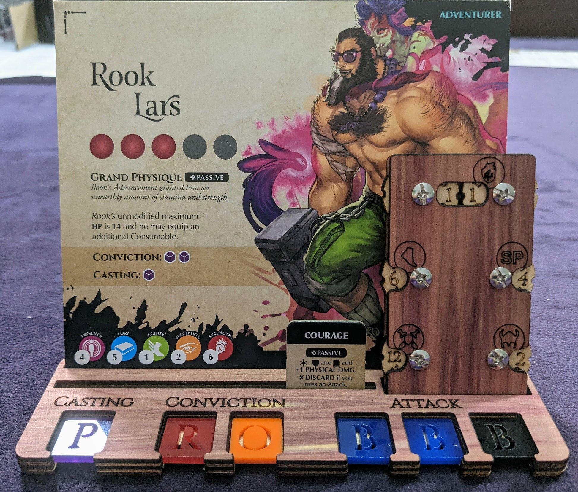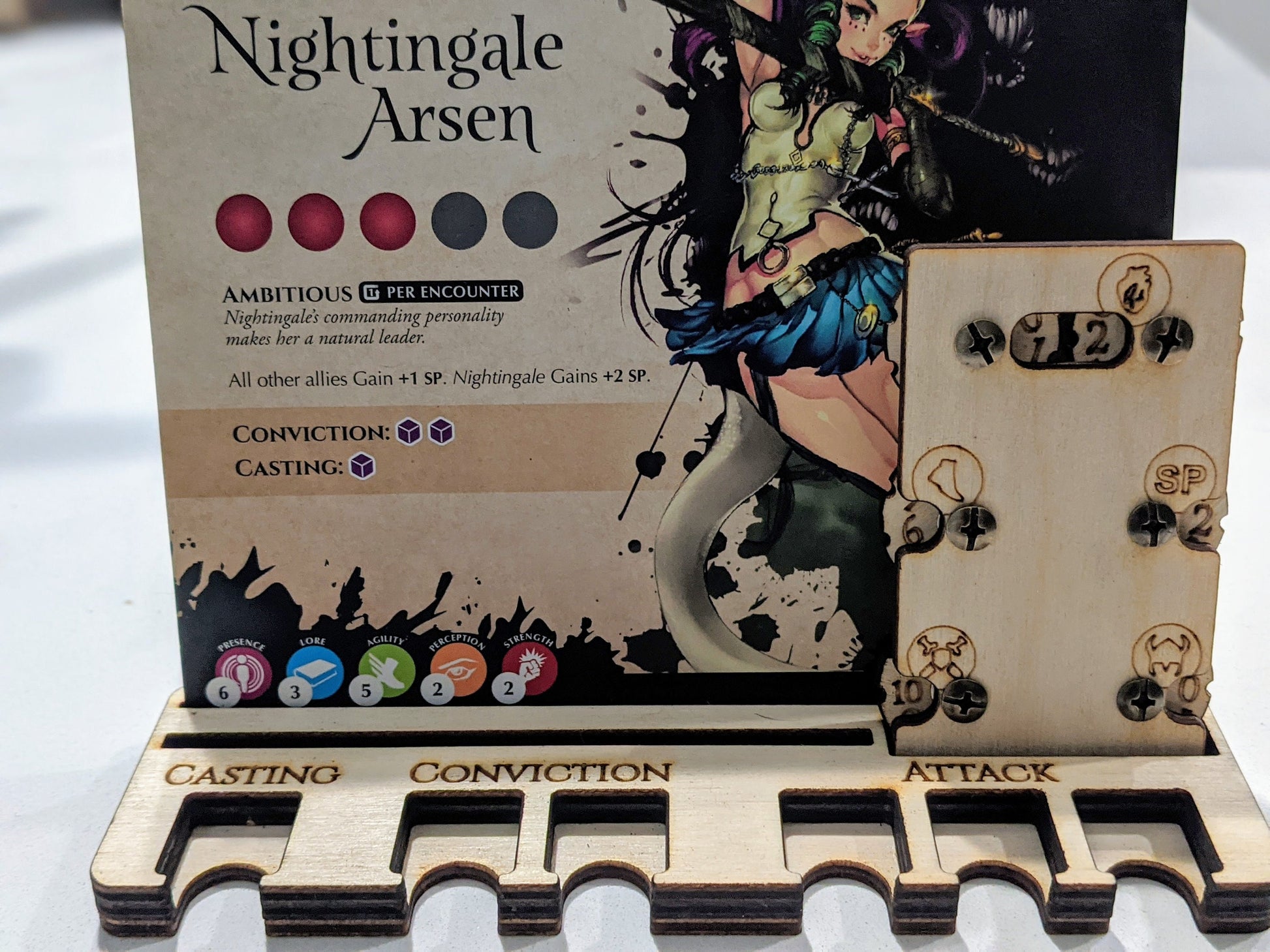 - 6 Slots to hold tokens or dice to represent players current Casting, Conviction, and Attack Dice