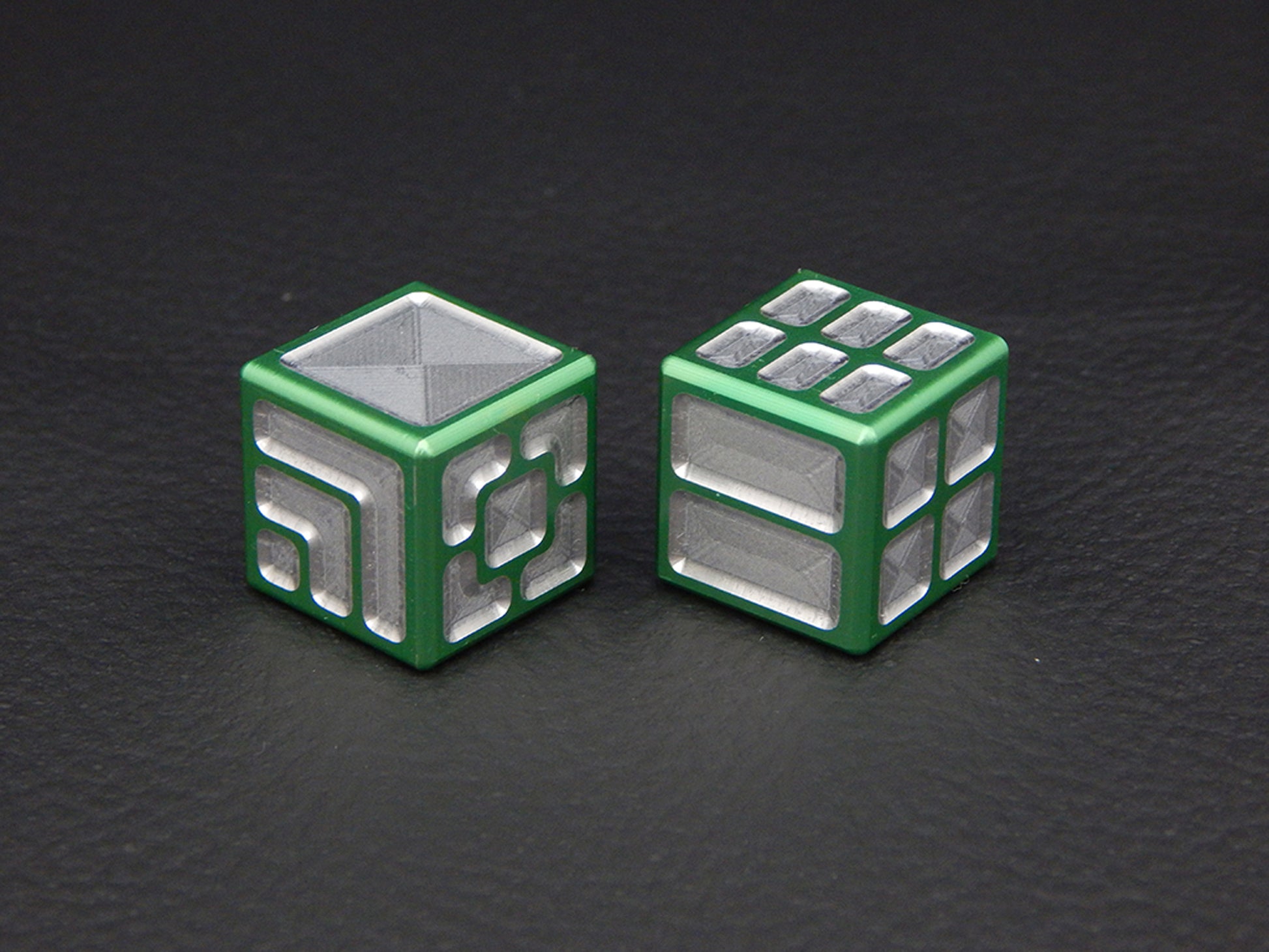 Our dice are made from aircraft-grade aluminum, providing solid strength and weight that adds confidence to your rolls. You'll feel the difference as soon as you pick them up! We take precision seriously, and our dice are engineered to meet exacting standards for balance. The center of mass is dialed into less than a human hair, less than .003 mm to be exact, ensuring that your rolls are fair and random every time.